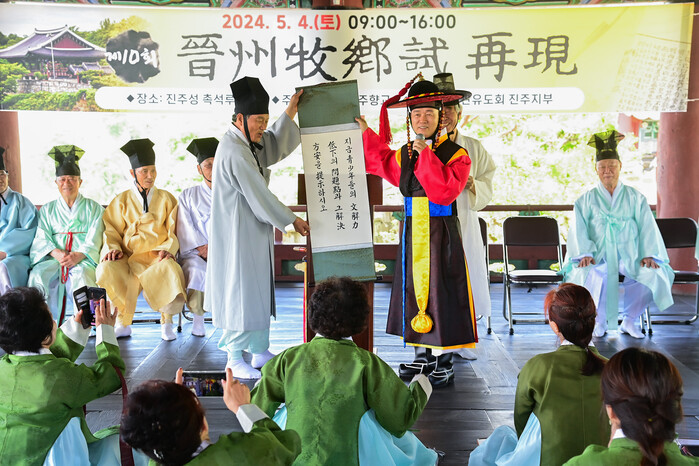 성균관유도회 진주지부(회장 정종성)는 지난 4일 오전 촉석루에서 지역유림과 관광객 등 300여 명이 참여한 가운데 조선시대 과거제인 ‘진주목 향시’ 재현 행사를 개최했다.