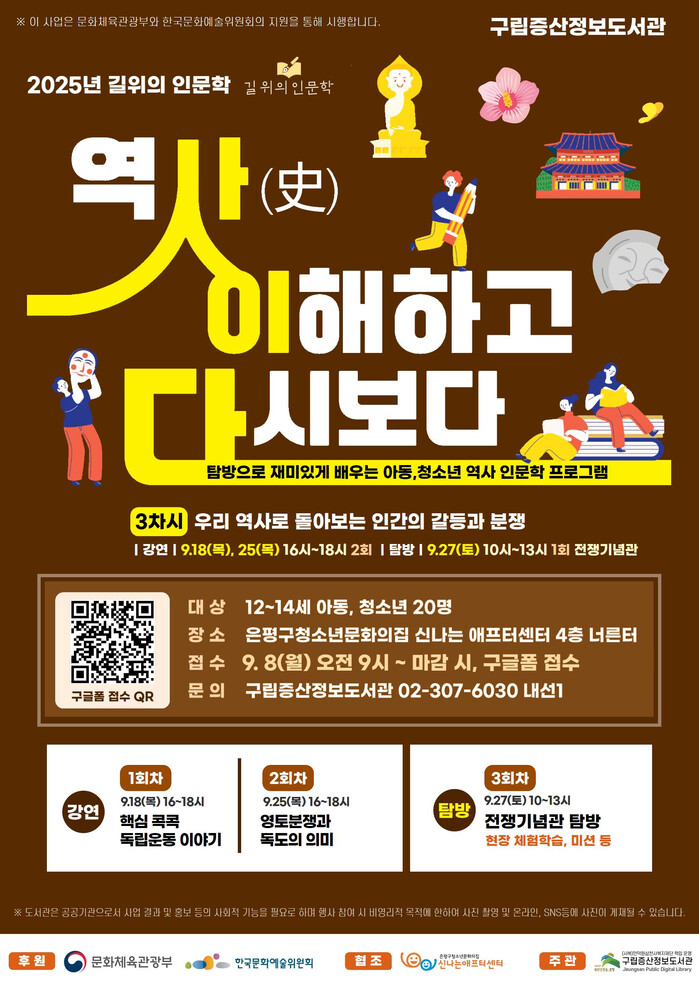 프로그램은 문화체육관광부와 한국도서관협회가 주최하는 ‘2025년 길 위의 인문학’ 사업의 일환이다. 이번 3차시 프로그램은 ‘우리 역사로 돌아보는 인간의 갈등과 분쟁’을 주제로 오는 18일과 25일에는 은평구청소년문화의집 신나는애프터센터에서 강연이 열리며, 오는 27일에는 전쟁기념관 현장 탐방으로 진행된다.
