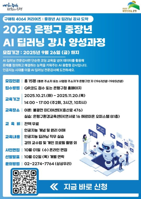 [시민일보 = 이대우 기자] 서울 은평구(구청장 김미경)는 중장년층의 경력전환과 창직(創職)을 지원하기 위해 ‘구해줘 4064 커리어즈 시즌2: AI 인공지능(딥러닝) 교육 전문가 양성과정’ 참여자를 모집한다고 밝혔다.