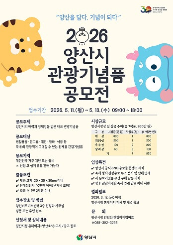 [양산=최성일 기자]경남 양산시(시장 나동연)는 시 승격 30주년과 ‘2026 양산방문의 해’를 맞아 관광도시 브랜드 가치를 높이고 지역을 대표할 관광상품을 발굴하기 위해 '2026년 양산시 관광기념품 공모전'을 개최한다고 밝혔다.