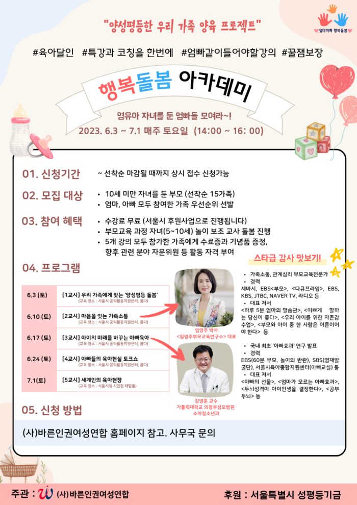 6월 3일 ~ 7월 1일까지 5회차로 진행되는 ‘행복돌봄 아카데미 1기’는 분야별 전문강사들을 통해서 젊은 부부들의 돌봄역량을 강화하고 각 가정에 맞는 양성평등한 돌봄문화를 고민하는 부모들에게 실질적인 도움을 주고자 한다.