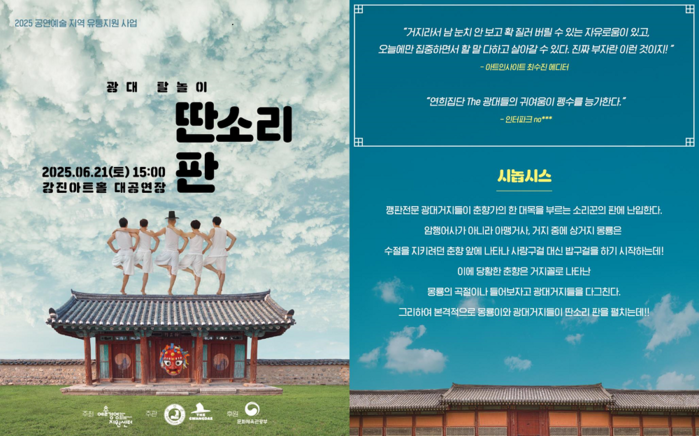 ‘딴소리판’은 문화체육관광부가 후원하고 (재)예술경영지원센터가 주최하는 ‘공연예술 지역 유통지원 사업’을 통해 강진아트홀이 지원받은 우수작품 4편 중 세 번째 공연이다. 고전 판소리를 깨고 비트는 광대 거지들의 유쾌한 유랑을 담은 공연으로 엉뚱한 상상과 재치 가득한 연출로 관객들에게 즐거움을 선사하는 공연으로 정평이 났다.