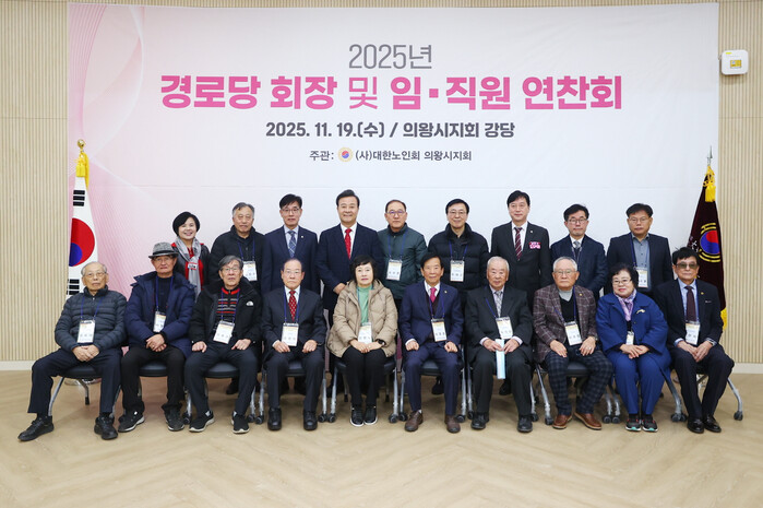 | ▲ 김성제 의왕시장(뒷줄 왼쪽 네번째)이‘2025년 경로당회장 및 지회 임직원 연찬회’진행 후 참석자들이 기념 촬영을 하고 있다 |