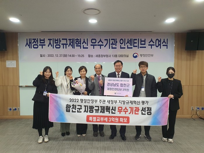 합천군은 지표 전반에서 높은 성과를 거두며 규제혁신 노력을 인정 받아 우수기관으로 선정됐으며, 이번 우수기관 선정으로 군은 재정인센티브 3억 원을 받게 되었다.