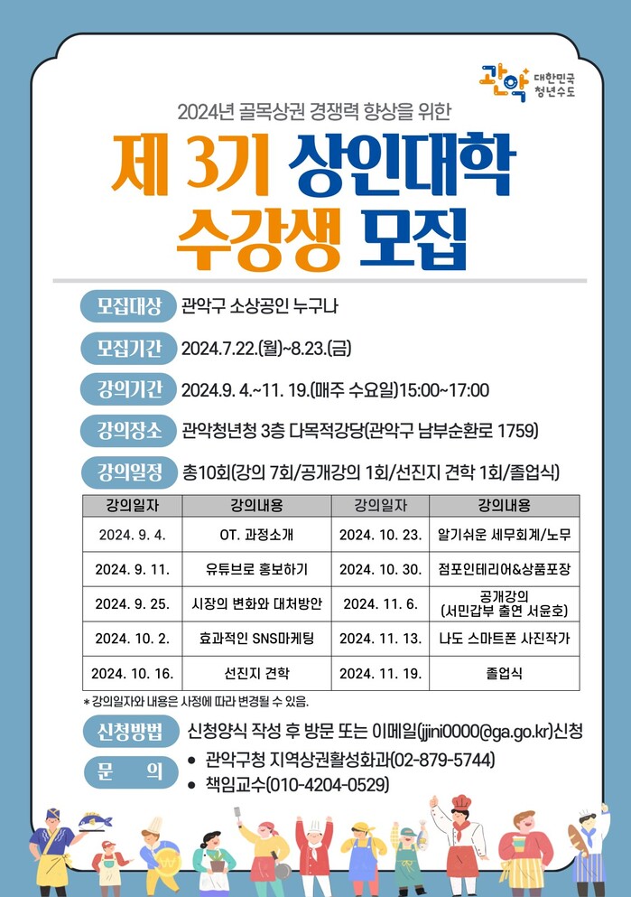 [시민일보 = 여영준 기자] 서울 관악구(구청장 박준희)는 소상공인 점포의 매출 증대와 골목상권 활성화를 위해 오는 9월4일~11월19일 '제3기 관악구 골목상권 상인대학'을 운영한다고 밝혔다.