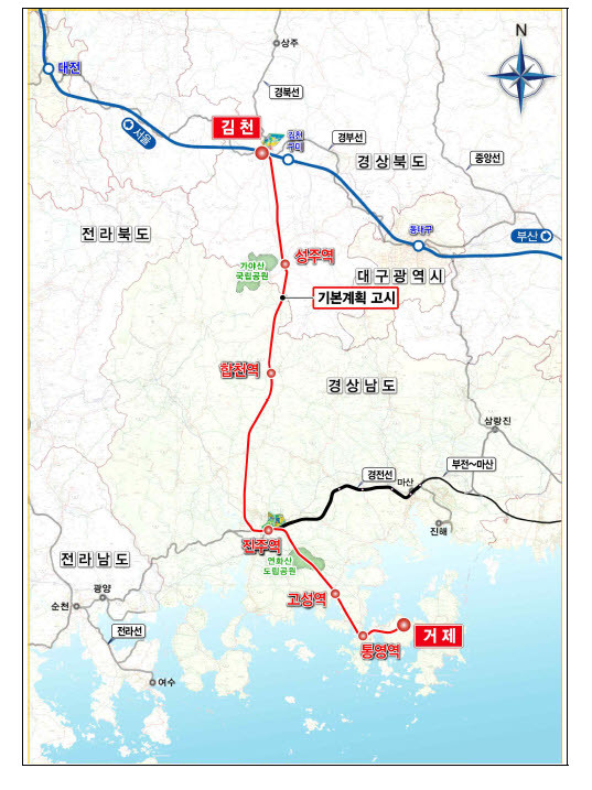 국토교통부는 경북 김천시 에서 경남 거제시를 연결하는 총 연장 177.9㎞, 총사업비 4조 8015억 원이 투입되는 남부내륙철도 건설사업의 기본계획을 확정해 지난 13일 관보에 고시했다.