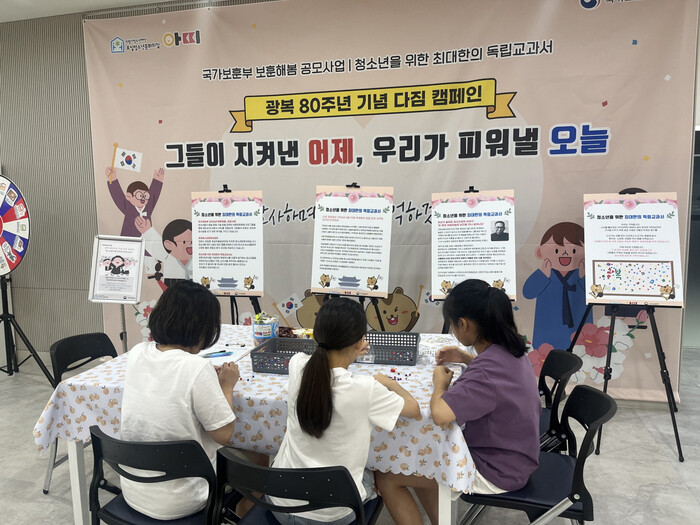 청소년들은 전시 판넬에 독립운동사의 이해, “잊지 않겠습니다”라는 다짐 스티커 부착 활동을 통해 독립 역사의 의미를 직접 느끼고 공유했다. 또한, 청소년시설에서 제공한 ‘태극기 키링 만들기 키트’는 참가자들에게 광복의 역사적 가치를 직접 체험하고 기억할 수 있는 상징적인 기념품이 됐다.
