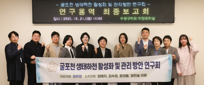 정유정 대표 의원은 “굴포천 복원 사업은 외적 완성뿐만 아니라 지속 가능한 관리와 적극적인 주민 참여를 통한 활성화가 핵심이라는 점을 확인했으며 특히 연구용역을 통해 오염관리 및 생태네트워크 유지를 위한 시민 참여형 사후관리 시스템 구축 방안을 구체화했다”고 말했다.