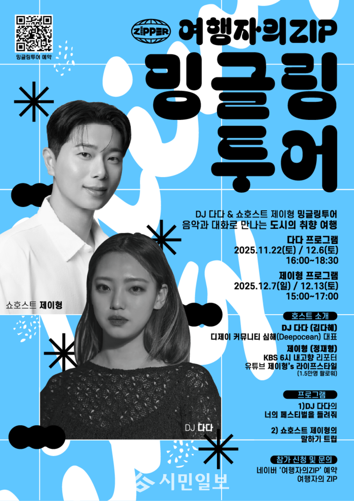 지난달 22일 시작한 이번 프로그램은 총 4회로 운영되며, ▲음악과 산책을 결합한 투어(12월 6일)와 ▲대화 기술을 배우는 워크숍(12월 7일, 12월 13일) 두 가지 테마로 구성됐다. DJ 다다(김다혜)와 KBS ‘6시 내고향’ 리포터 제이형이 호스트로 참여하며, 회당 15명의 참가자를 네이버 예약으로 사전 모집한다.