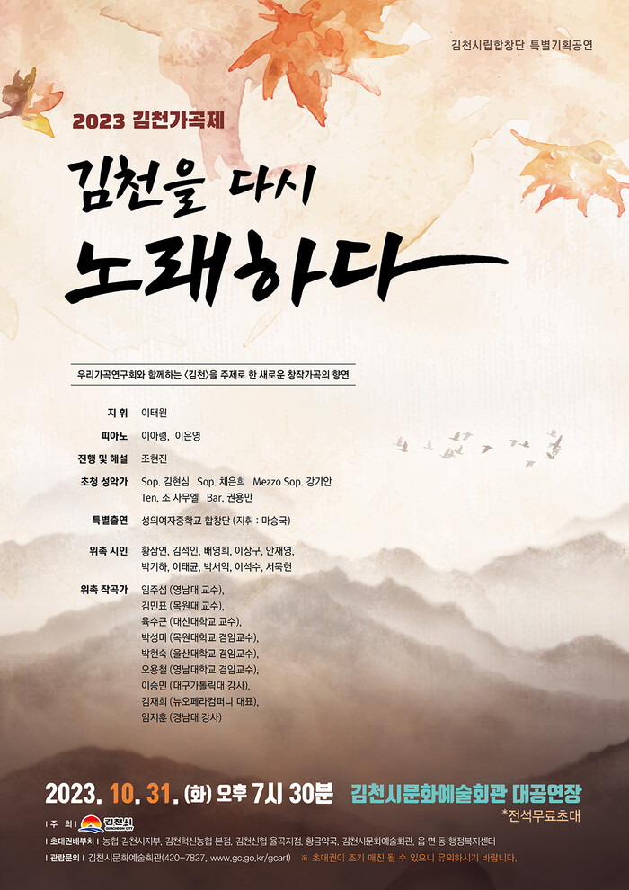 [김천=박병상 기자] 경북 김천문화예술회관은 다가오는 10월 31일 화요일 19시 30분 문화예술회관 대공연장에서 시립합창단 김천가곡제 『김천을 다시 노래하다』를 개최한다.