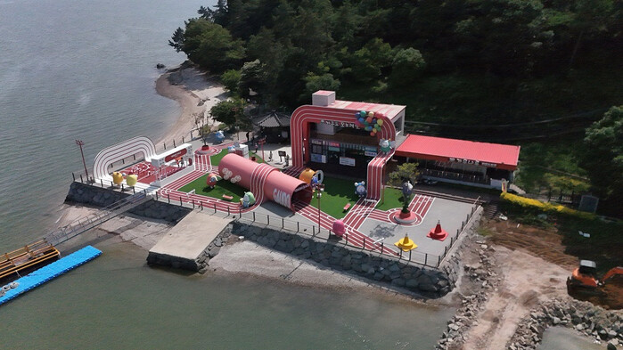 가우도 입구에 들어서면 가장 먼저 ‘웰컴 가우도’라는 대형 미디어 포토존이 방문객을 맞이한다. 이곳은 가우도라는 공간의 상징성과 ‘십이몬 레이스’ 세계관을 동시에 보여주는 미디어 조형물로, 낮에는 포토존으로, 밤에는 조명 연출로 다양한 매력을 발산한다. 이어지는 ‘십이몬 스퀘어’는 이번 콘텐츠의 중심 공간이다. 실제 레이스가 펼쳐지는 듯한 러닝트랙이 깔려 있고, 십이몬 캐릭터들이 그 위에 배치되어 관람객과 상호작용한다.