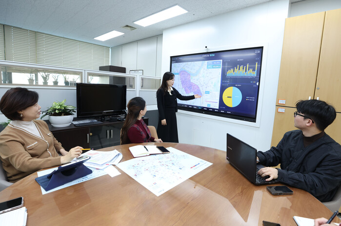 | ▲ 구청 주민자치과 관계자들이 '스마트강남 동장실'을 통해 동별 인구 현황을 살펴보고 있다. (사진=강남구청 제공) |
