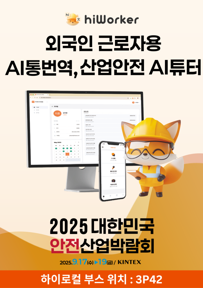 외국인 근로자를 위한 AI 솔루션 전문기업 하이로컬(대표 윤정호)이 9월 17일부터 19일까지 킨텍스에서 열리는 '2025 안전산업박람회'에 참가해 하이워커의 주요 기능과 현장 적용 사례를 선보일 예정이다. 이번 전시회를 통해 국내외 바이어 및 공공기관과의 협력을 확대하고 전국 단위 보급에 나선다는 계획이다.