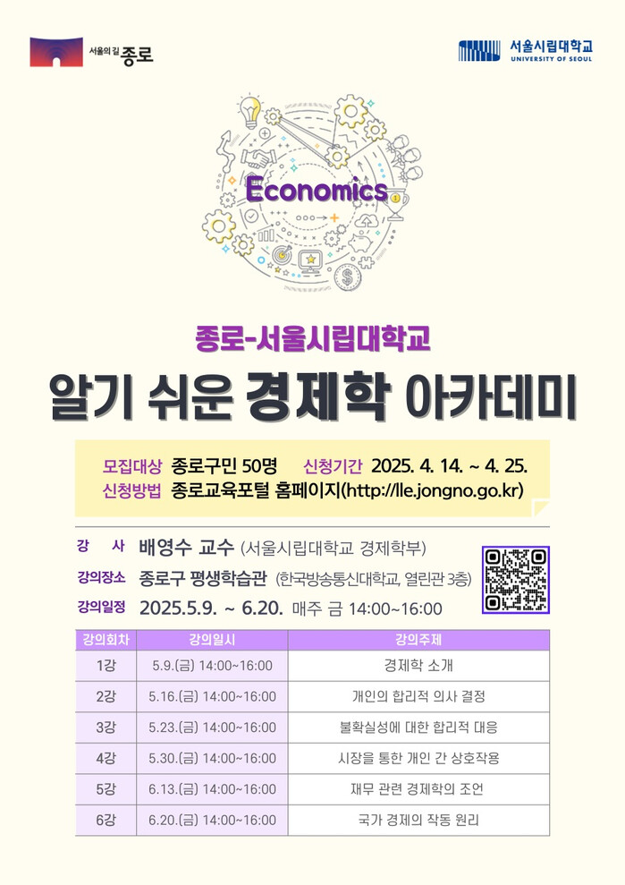 이번 프로그램은 5월9일부터 6월20일까지 매주 금요일 오후 2시~4시, 총 6회차에 걸쳐 종로구 평생학습관(한국방송통신대학교 열린관 3층)에서 진행된다. 강의는 배영수 서울시립대학교 경제학부 교수가 맡는다.