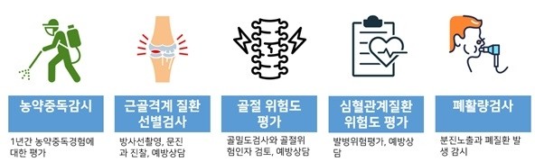 검진은 여성 농업 인의 농작업 특징을 고려해 근골 격계, 심혈 관계, 골절· 손상 위험도, 폐활량, 농약 중독 총 5개 영역 10개 항목에 대해 진행된다.