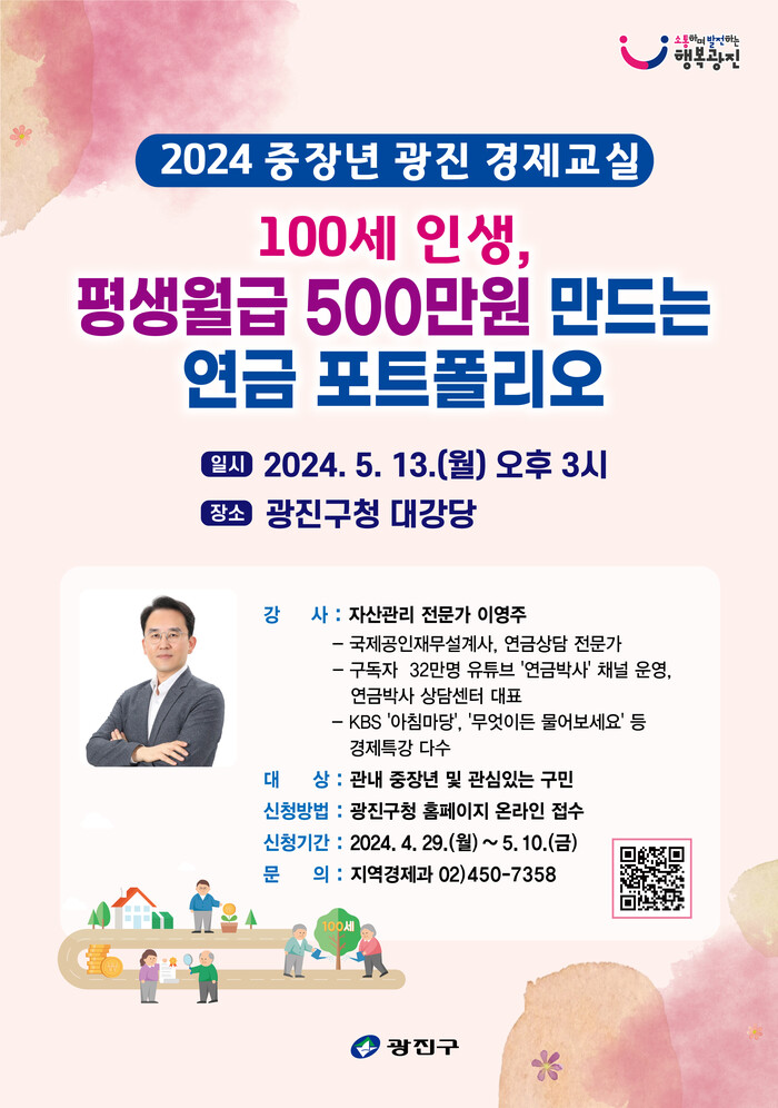 [시민일보 = 여영준 기자] 서울 광진구(구청장 김경호)가 효과적인 노후설계를 돕고 금융문해력을 높이기 위해 오는 5월13일 오후 3시, 광진구청 대강당에서 ‘2024 중장년 경제교실’을 개최한다.