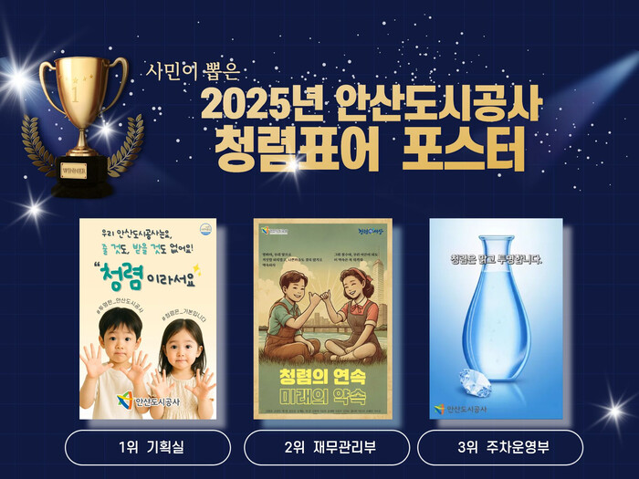 이번 공모전은 공사 내 각 부서가 청렴표어를 담은 포스터를 제작해 시민과 임직원의 투표로 우수작을 선정하는 한편, ‘청렴한 안산 만들기’에 대한 공감대를 형성하기 위해 마련됐다.