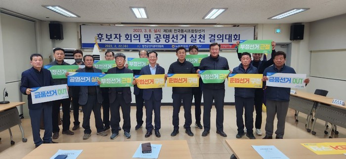 [합천=이영수 기자] 합천군선거관리위원회는 지난 22일 합천군선거관리위원회 2층 회의실에서 오는 3월8일 실시하는 '제3회 전국동시조합장선거' 후보자회의 및 공명선거 실천 결의대회를 개최했다.