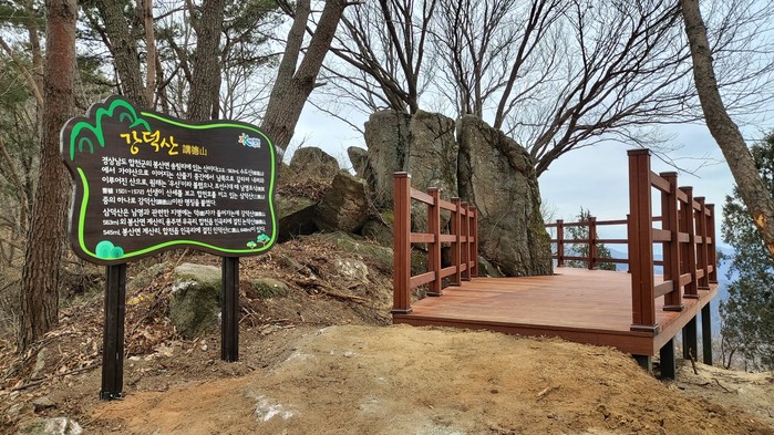이번 등산로 조성사업은 ‘송림마을 임도 정상부’에서 ‘강덕산 정상부’까지 약 600여 미터 구간 등산로를 개설하는 사업으로 정상부 일원에 전망데크 및 정각을 설치해 탐방객들의 편의를 제공하기 위한 쉼터를 조성했다.