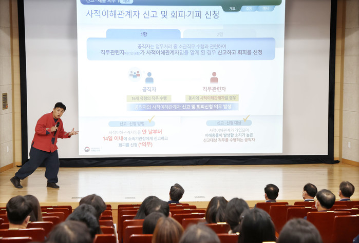 이번 교육에서는 올해 5월 19일부터 시행된 '공직자의 이해충돌방지법'에 대해 국민권익위원회 청렴연수원 정승호 강사를 초청해 공직자가 지켜야 할 10대 행위기준을 실제 사례 중심으로 설명했다.