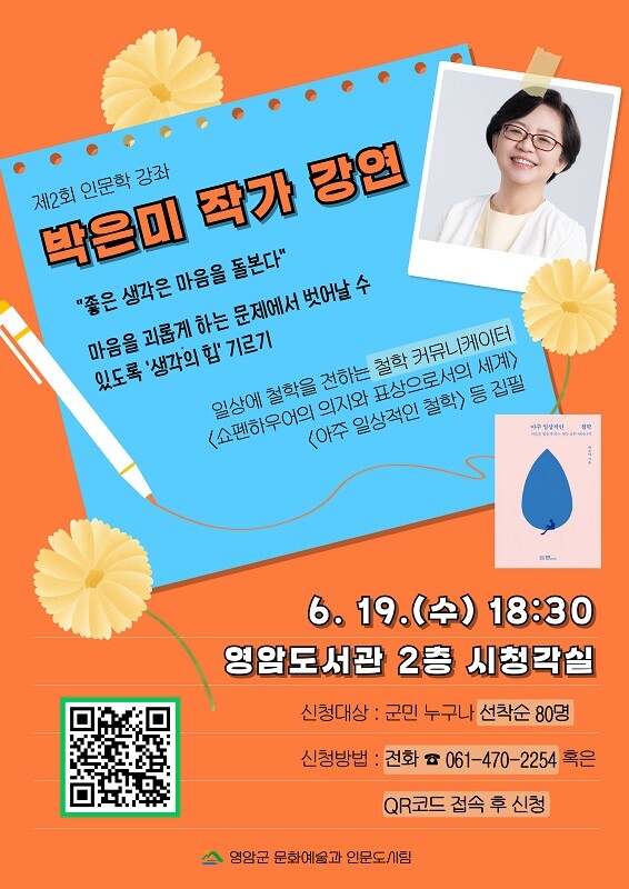 박 작가의 철학 강좌는 현장 신청 포함, 80명을 선착순으로 모집한다. 수강신청은 영암군 인문도시팀 전화, QR코드, 링크로 받는다. 강좌에 대한 자세한 내용은 영암군 홈페이지 공지사항에서 볼 수 있다.
