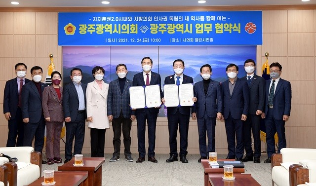 [광주=정찬남 기자] 광주광역시와 광주광역시의회는 24일 시의회 열린시민홀에서 지방의회 인사권 독립에 따른 인사운영 등 업무 전 분야에 대한 업무협약을 체결했다.