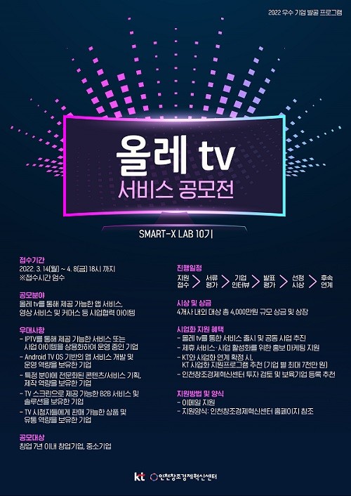 인천창조경제혁신센터는 “이번 ‘올레 tv 서비스 공모전’을 통해 역량 있는 미디어 서비스 기반 신규 기업을 많이 만날 수 있길 기대한다”며, “관심 있는 기업의 많은 참여를 바란다”고 전했다.