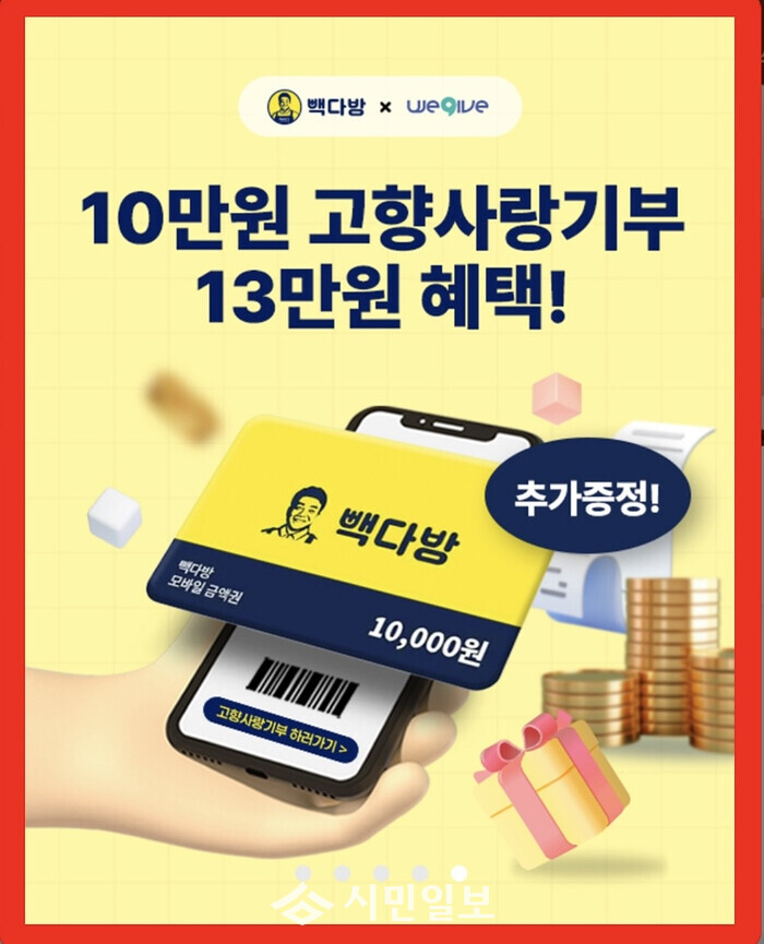 이번 이벤트는 고향사랑기부제 참여의 진입장벽을 낮추고, 보다 많은 국민이 기부를 통해 지역과 상생할 수 있도록 마련된 민관 협력형 캠페인이다. 빽다방 앱의 메인 배너 또는 이벤트 링크를 통해 위기브 이벤트 페이지에 접속해 광주 동구에 10만 원 이상 기부하면 자동으로 참여가 인정되며, 기부자에게는 빽다방 1만 원 모바일 금액권이 지급된다.