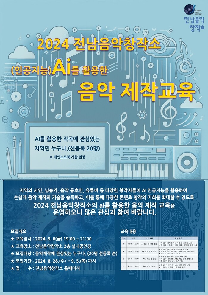 전남음악창작소는 이번 프로그램을 통해 지역의 시인, 낭송가, 음악 동호인, 유튜버 등 다양한 창작자들이 AI 인공지능을 활용한 음악 제작 기술을 손쉽게 습득하고, 이를 통해 콘텐츠 창작의 기회를 확대해 간다는 방침이다.
