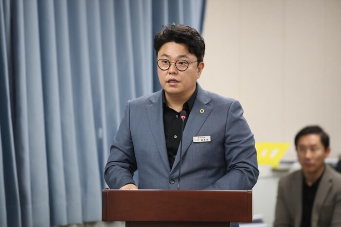 | ▲ 김호진 도의원이 보건복지환경위원회 회의에서 조례안에 대한 제안설명을 하고 있다.(출처=전남도의회) |