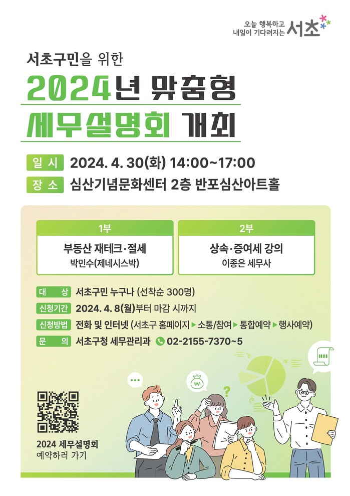 참석을 희망하는 구민은 8일부터 서초구청 홈페이지 또는 전화로 신청하면 되고 모집인원은 선착순 300명이다. 기타 자세한 내용은 서초구청 세무관리과 세무정책팀으로 문의하면 된다.