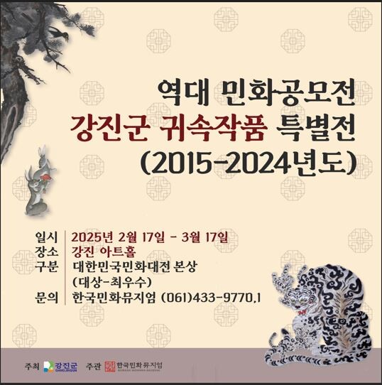 전남 강진군 대구면 청자촌에 위치한 한국민화뮤지엄(관장 오석환, 오슬기)이 오는 17일부터 3월 17일까지 강진아트홀에서 역대 민화공모전 강진군 귀속작품 특별전을 선보인다. 강진군 주최 한국민화뮤지엄 주관으로 진행되는 이번 특별전은 역대 대한민국민화대전의 본상 수상작으로 강진군에 귀속된 작품 중에서도 엄선된 작품을 한 자리에서 만나볼 수 있다.