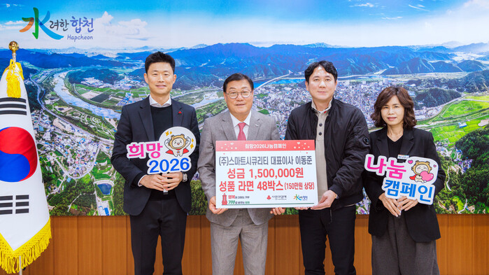 김윤철 합천군수는 “올해에도 고향의 이웃들을 생각하는 마음으로 따뜻한 온정을 베풀어 주셔서 감사드리며, 전달해주신 마음은 도움이 필요한 이웃에게 잘 전달되도록 하겠다”고 감사의 마음을 전했다.