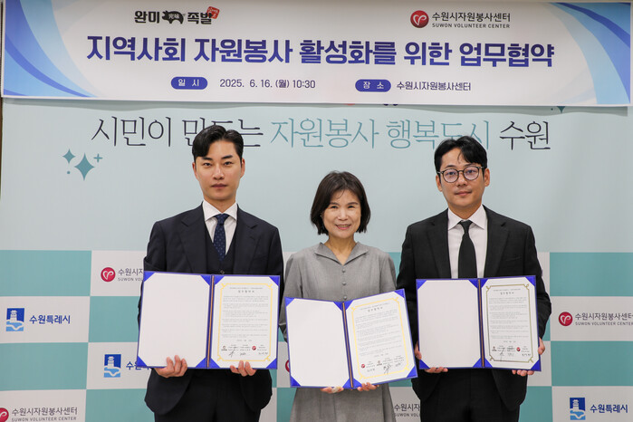 | ▲ 지난 16일, 수원시 장안구 수원시자원봉사센터에서 열린 ‘지역사회 자원봉사 활성화를 위한 업무협약식‘에 참석한 최영화 수원시자원봉사센터 센터장과 안규호, 장형희 (주)파로홀딩스(완미족발) 공동대표가 기념촬영을 하고 있다 (사진제공=완미족발) |