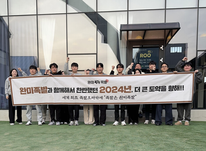 | ▲ 완미족발 본사 직원들이 24년 종무식에서 단체사진을 촬영하고 있다. (사진=완미족발 제공) |