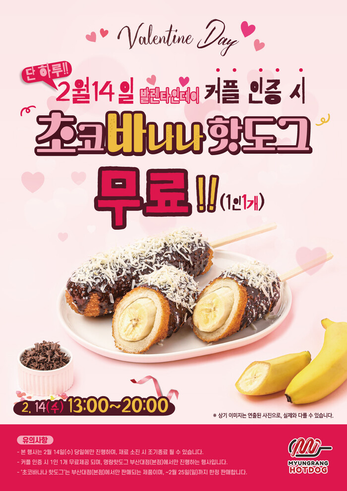 명랑핫도그 관계자는 “명랑핫도그 부산대점에서 특별하고 달달한 이벤트를 진행한다. 바나나 위에 뿌려진 달콤한 초콜렛과 코코넛 슬라이스, 그리고 연인간의 달콤한 사랑을 만끽하는 사랑스러운 발렌타인데이를 보내시길 바란다”고 전했다.
