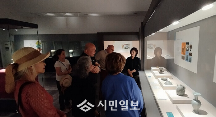 | ▲ 미국 스미소니언박물관 도슨트 일행이 지난 17일 고려청자박물관을 방문해 전시된 청자 유물들을 관람하고 있다. / 강진군 제공 |