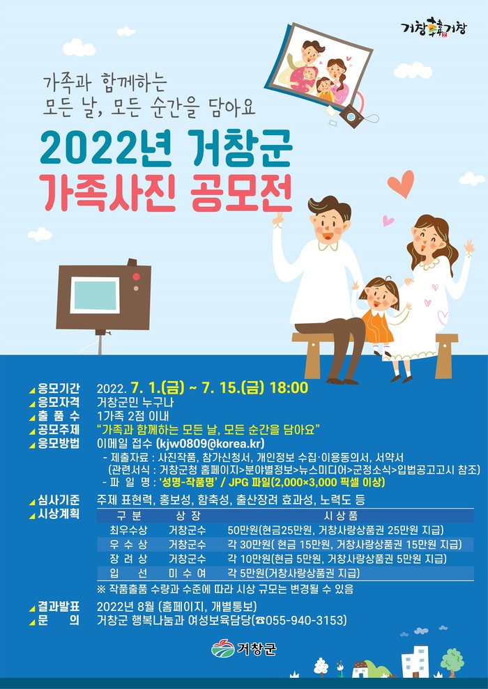 이번 공모전의 접수기간은 7월 1일부터 15일까지이며, ‘가족과 함께하는 모든 날, 모든 순간을 담아요’라는 주제로 사랑스러운 아이의 출생·성장 모습을 담은 사진, 다양한 형태의 가족이 행복한 모습을 표현한 사진, 아빠가 가사와 육아에 참여하는 사진, 거창의 명승지를 배경으로 찍은 가족사진 등이 공모 대상이다.
