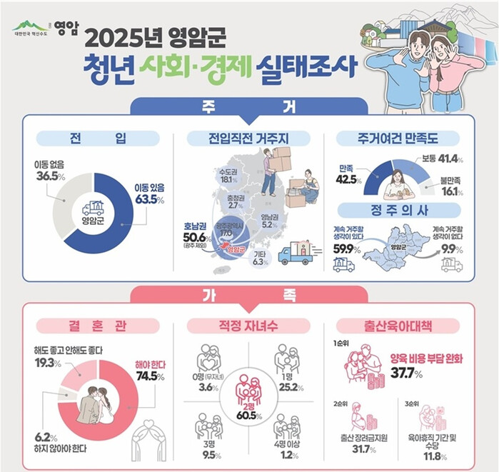 2025년 청년사회경제실태조사는 개인, 주거, 가족, 건강, 문화·여가, 삶의 질, 경제활동, 희망 일자리, 취업지원정책, 경제, 영암군 특성항목 11개 부문 42개 항목을 영암군 거주 19~49세 청년 1,008명이 응답한 결과이다.