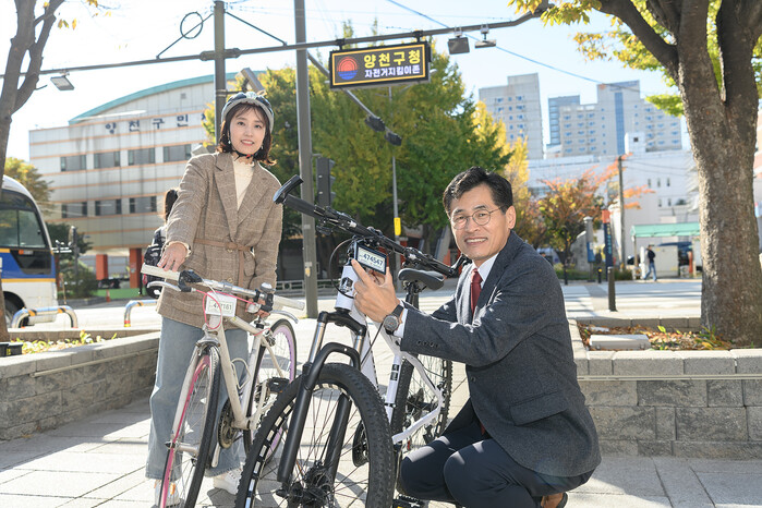 | ▲ 자전거 지킴이 솔루션 존에서 전자칩이 내장된 자전거번호판을 구민과 함께 부착 중인 이기재 구청장(오른쪽). (사진=양천구청 제공) |