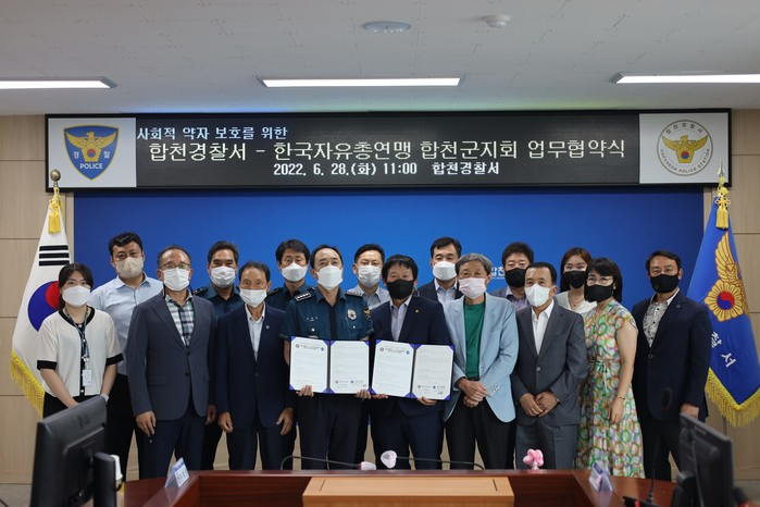 한국자유총연맹 합천군지회(회장 차기운)는 합천경찰서와 지난 28일 합천경찰서 2층 회의실에서 공동체 치안활성화 및 사회적 약자보호를 위한 업무협약식 가졌다.