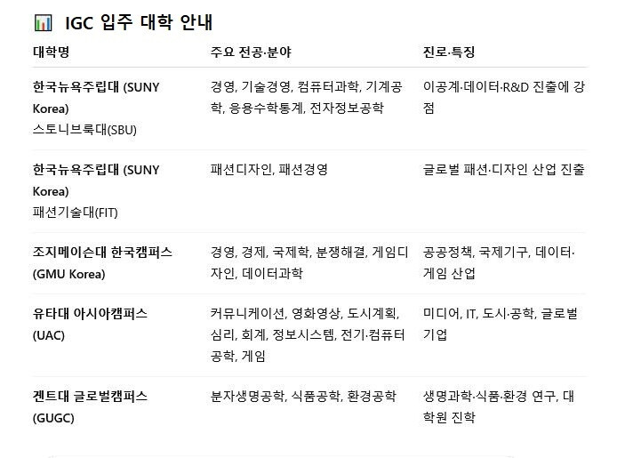 IGC 졸업생들이 국내ㆍ외 기업은 물론, 해외 연구기관과 국제기구 등 다양한 분야로 진출하고 있으며, 각 대학이 운영하는 취업 연계 프로그램, 기업 인턴십 이후 정규직 전환 사례, 글로벌 산학 프로그램 참여 등이 누적되면서 국제 커리어 네트워크가 형성되고 있다는 점도 강점으로 꼽힌다.