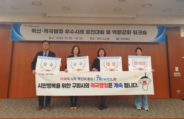 [구미=박병상 기자] 경북 구미시는 지난 25일 경주에서 진행된 「2023년 경상북도 혁신 및 적극 행정 우수사례 경진대회」에서 적극 행정 분야 ‘대상’, ‘우수상’, 혁신 분야 ‘우수상’, ‘장려상’을 받았다.
