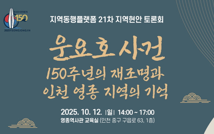 이번 토론회는 ‘1875 운요호 사건 150주년 기념행사’의 일환으로 영종진 운요호사건 150주년 기념 행사위원회가 주최하고 인천대 지역동행플랫폼과 RISE사업단, 사)영종진현양사업회, 영종도 주민단체들이 공동 주관한다.