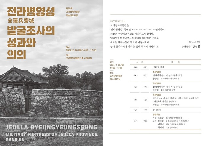 송양섭 교수(고려대학교 한국사학과)의 ‘조선 후기 강진 병영의 지휘체계와 군수 조달’이라는 주제 발표를 시작으로 석순현 팀장(한울문화재연구원)이 ‘전라병영성의 축성과 공간구성’이라는 주제로 전라병영성의 규모와 시설에 대한 발표로 이어진다. 마지막 발표는 박정민 교수(명지대학교 미술사학과)가 맡았으며, 전라병영성 내 출토된 명문 자기(銘文 瓷器)를 중심으로 조선 전기 자기의 출토 양상과 특징을 살펴보는 시간을 갖는다.