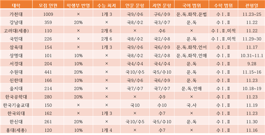 올해는 내신이나 수능을 아예 반영하지 않거나 반영 비율을 축소한 대학도 늘었다. 국민대와 가천대 등 6개 대학은 내신을 반영하지 않으며, 상명대, 수원대, 을지대 등 9개 대학은 수능을 반영하지 않는다. 수능최저학력기준을 요구하더라도 탐구 포함 1과목 3등급 정도로, 중위권 학생이라면 어렵지 않게 충족할 수 있다.