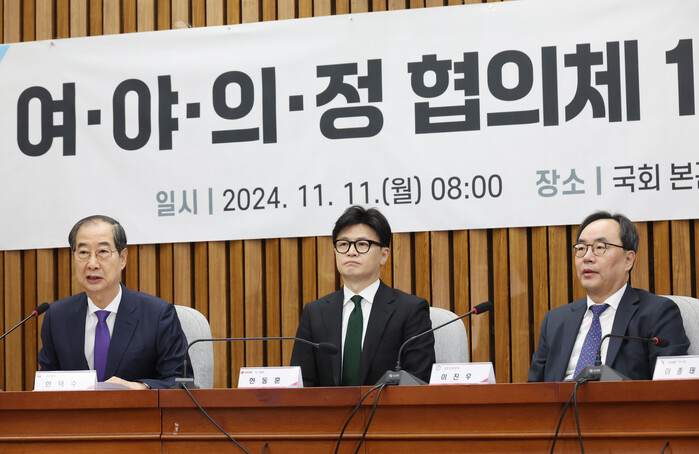한 대표는 이날 국회에서 열린 여야의정 협의체 첫 회의에서 "여야의정 협의체를 당초 민주당이 가장 먼저 말을 꺼낼 만큼 선의가 있다고 믿는다"며 "여기 모인 우리 모두 민주당의 참여를 기다리고 언제든지 환영한다는 말씀을 드린다"고 전했다.