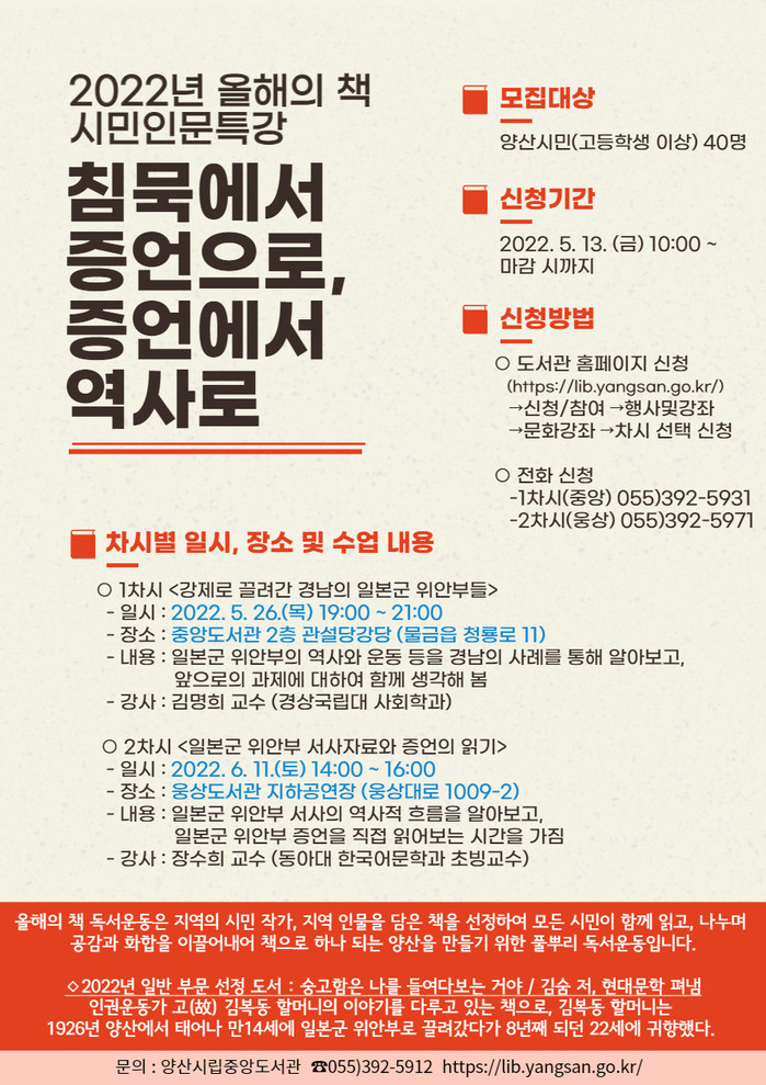 양산시립도서관에서는 2022년 올해의 책 시민인문특강‘침묵에서 증언으로, 증언에서 역사로’를 운영한다.
