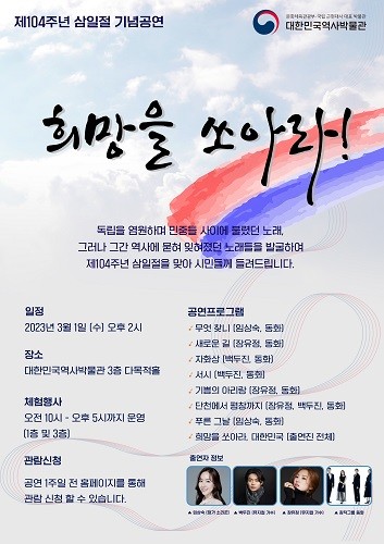 [시민일보 = 이창훈 기자] 대한민국역사박물관이 주최하고 글로벌 콘텐츠 창작소 이비컴퍼니가 진행을 맡은 제104주년 삼일절 기념 공연 ‘희망을 쏘아라!’가 뜨거운 열기 속에서 마무리됐다고 10일 밝혔다.