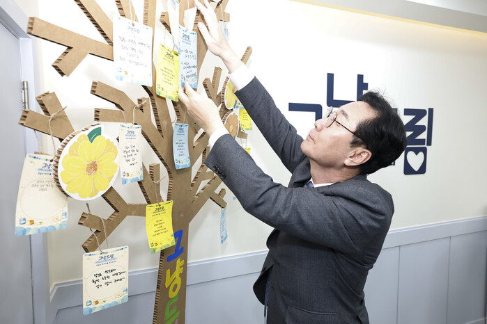 | ▲ 정명근 화성특례시장이 그냥드림 내부 '희망나무'에 작성한 쪽지를 달고 있다 /사진제공=화성특례시 |